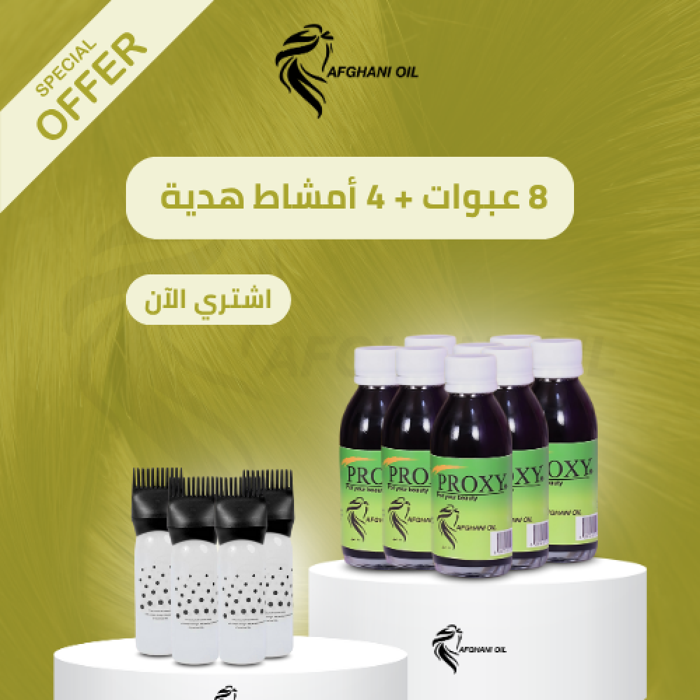 احصلي على ثماني عبوات من زيت بروكسي الأفغاني للشعر مع أربعة أمشاط لتوزيع مثالي ومتوازن الزيت غني بالعناصر الطبيعية التي تُغذي فروة الرأس بعمق مع الاستمرار، بتلاحظين فرق ما يتصدق من النعومة والكثافة.